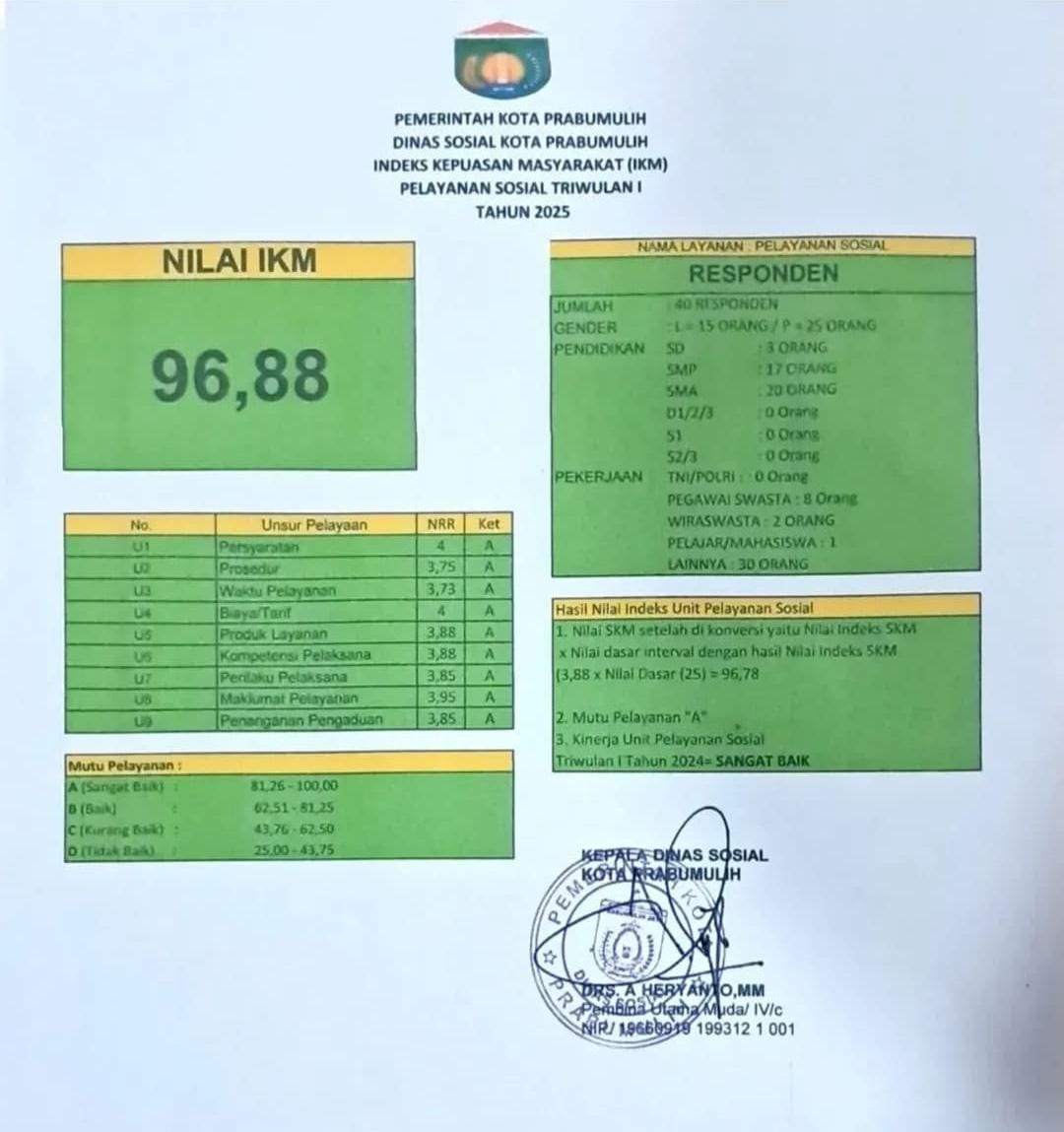 INDEKS KEPUASAN MASYARAKAT DINAS SOSIAL KOTA PRABUMULIH TRIWULAN I TAHUN 2025